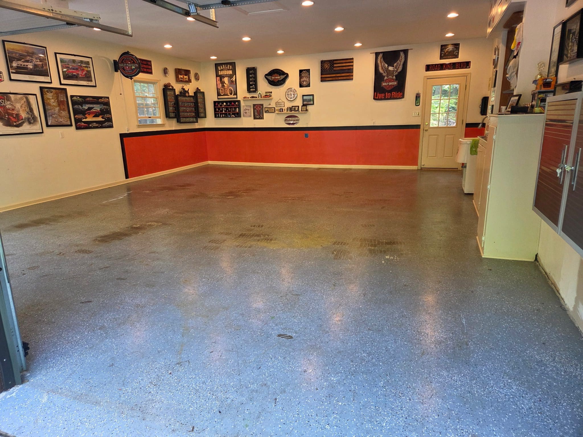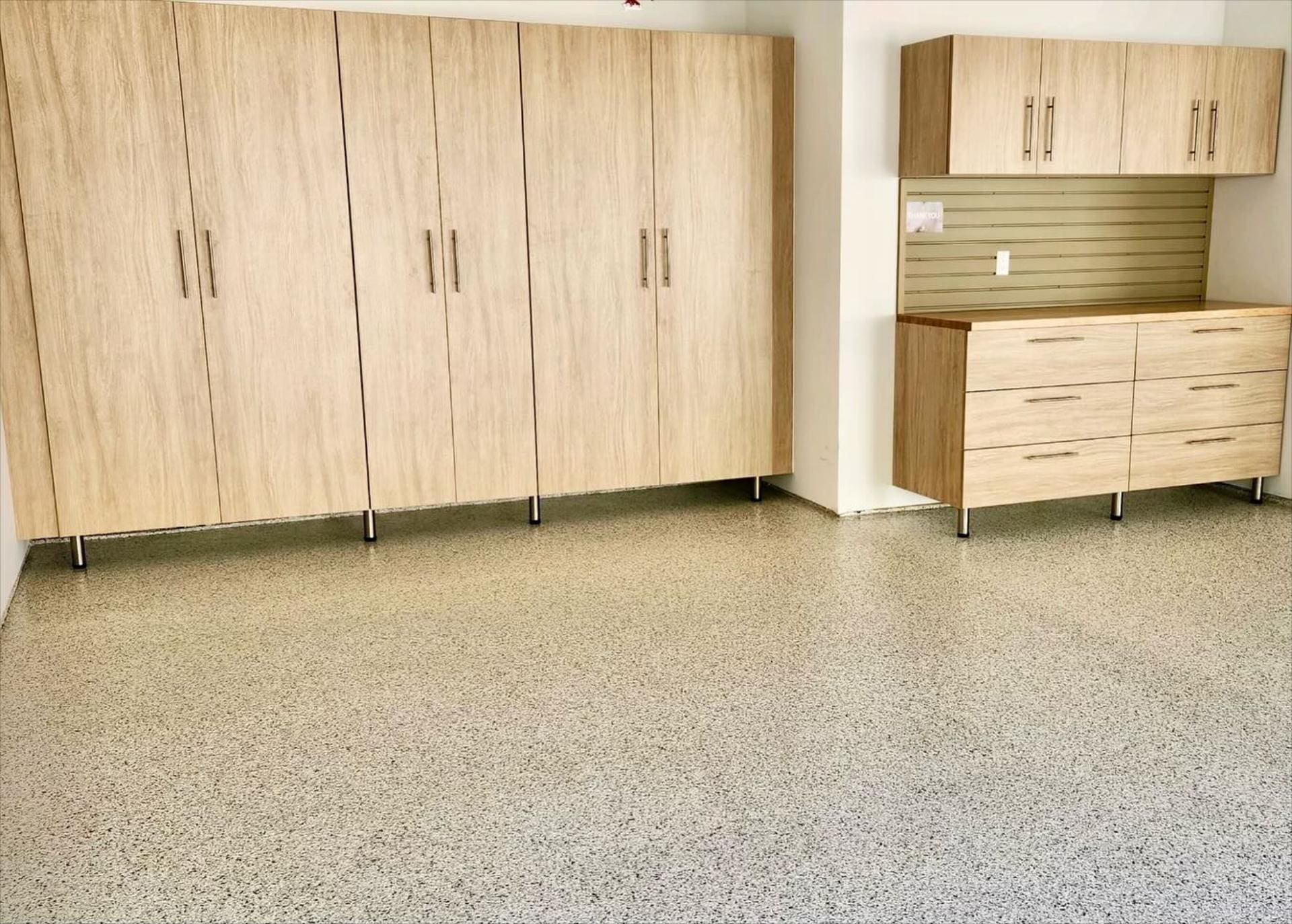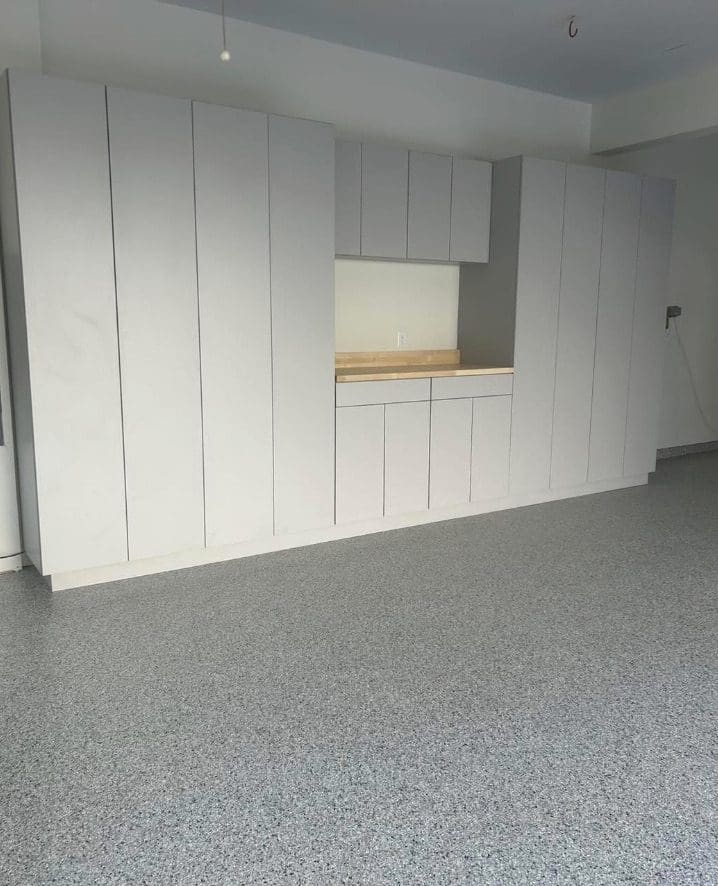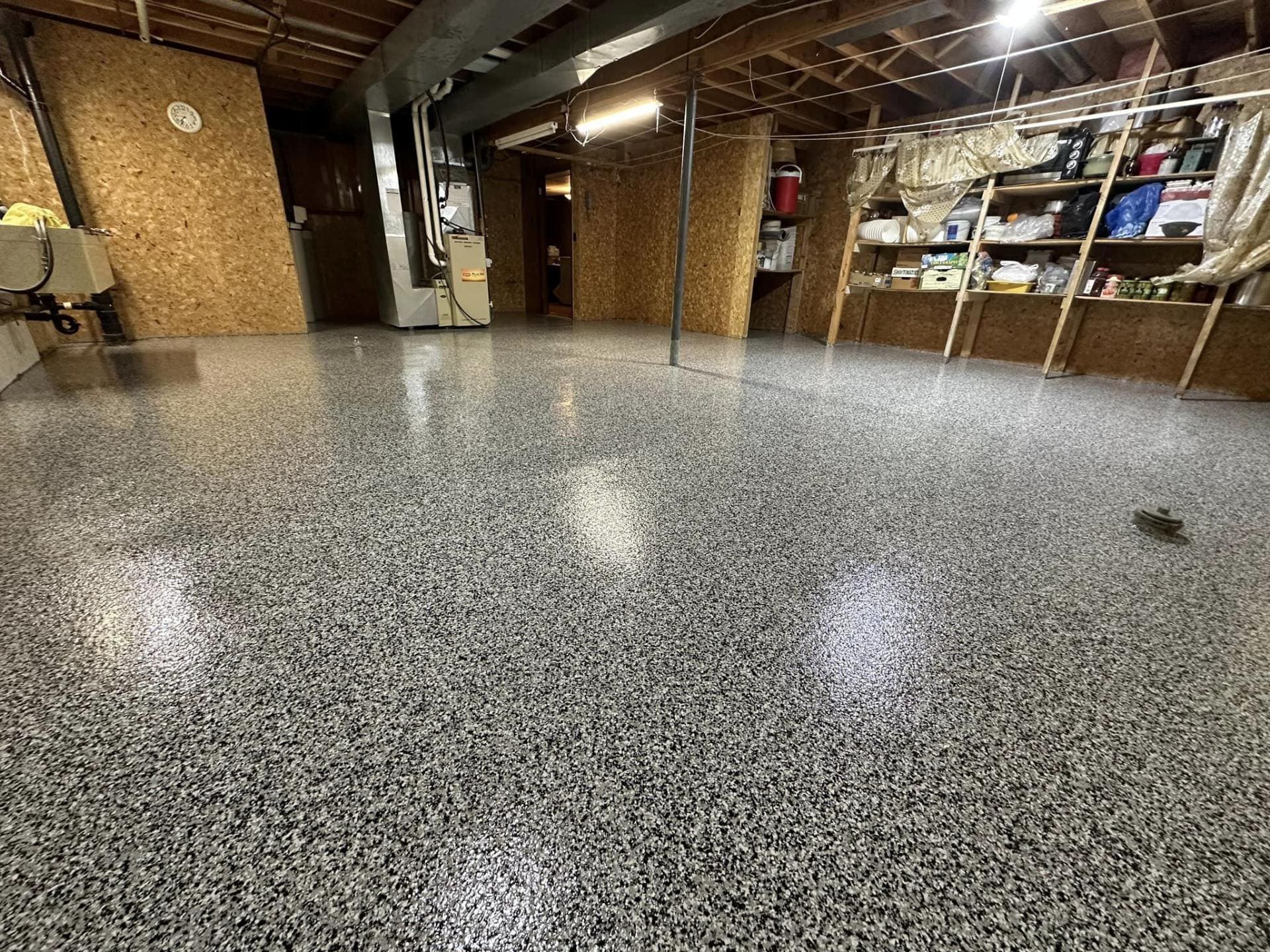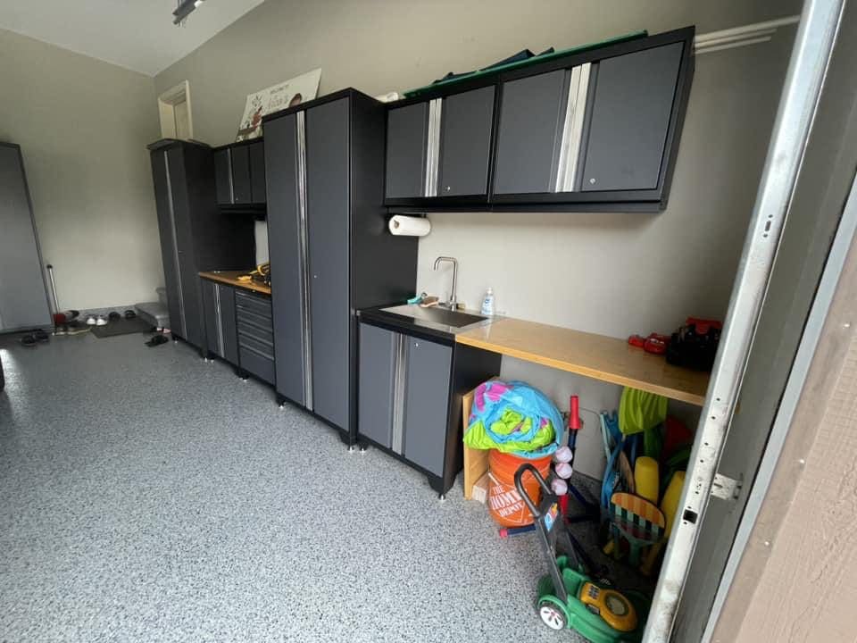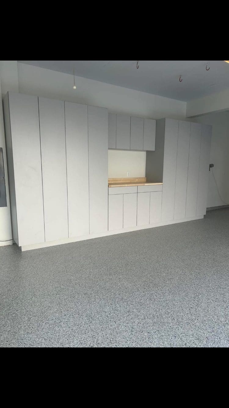 After custom shelving painting and flake floor was installed