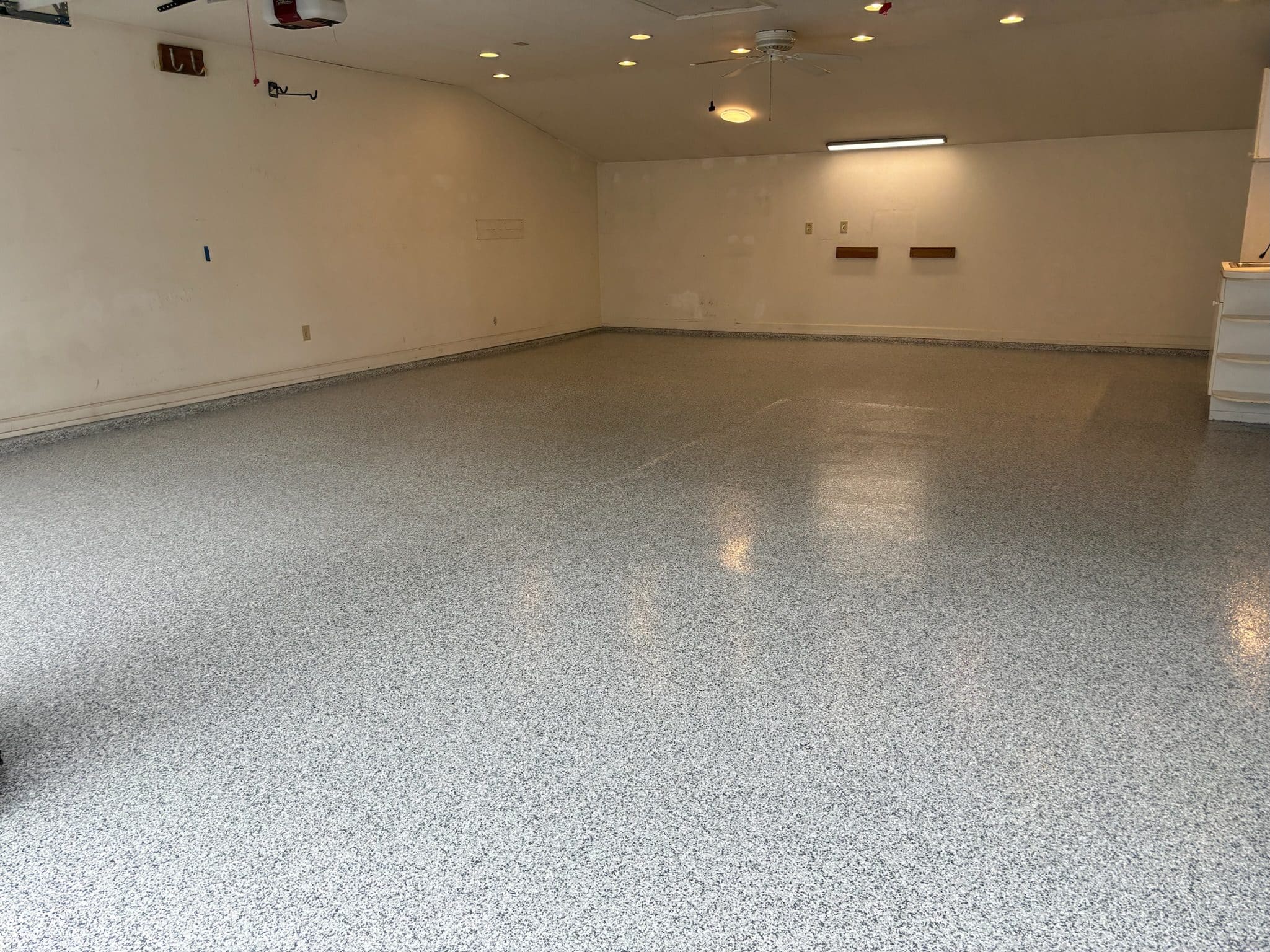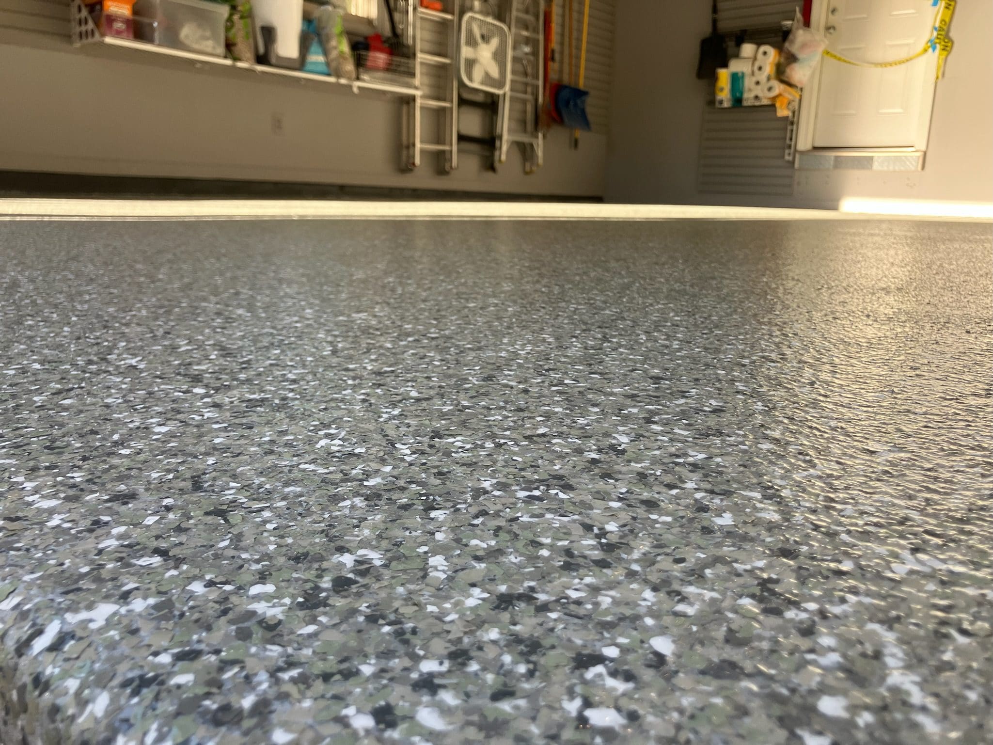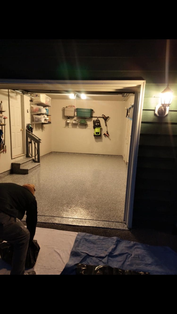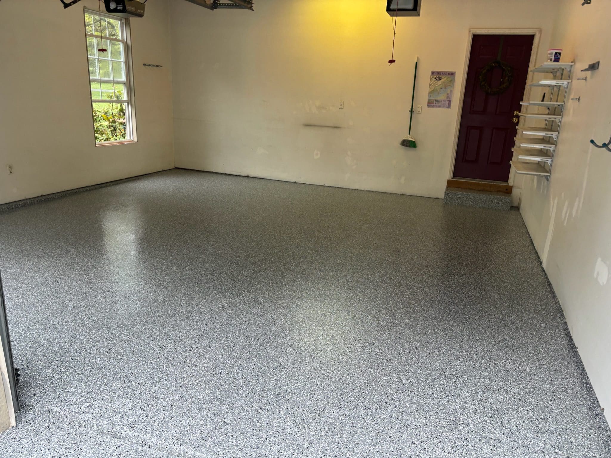After custom shelving painting and flake floor was installed