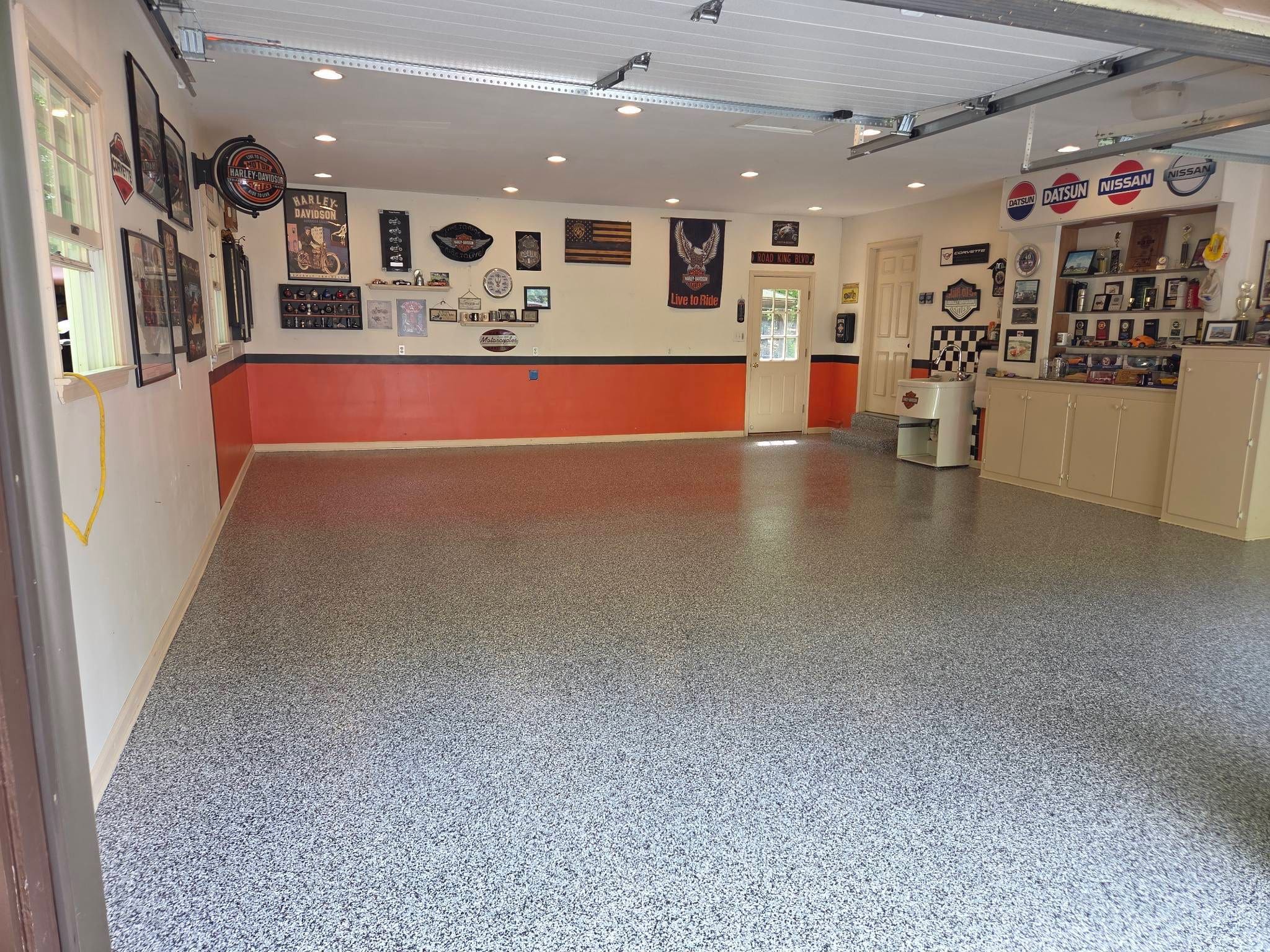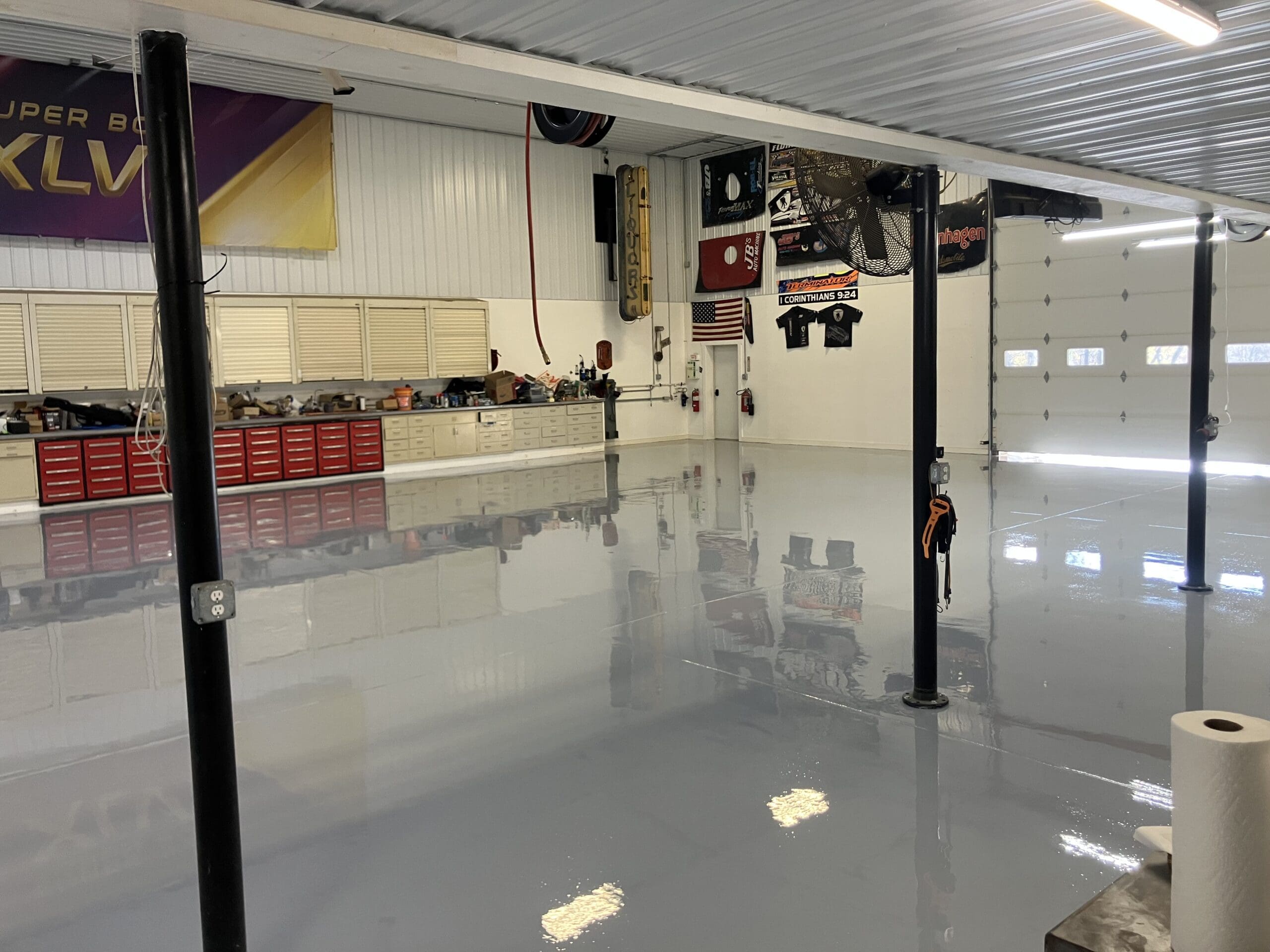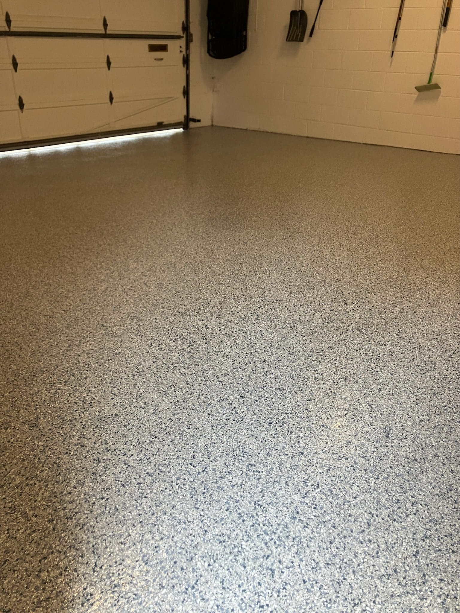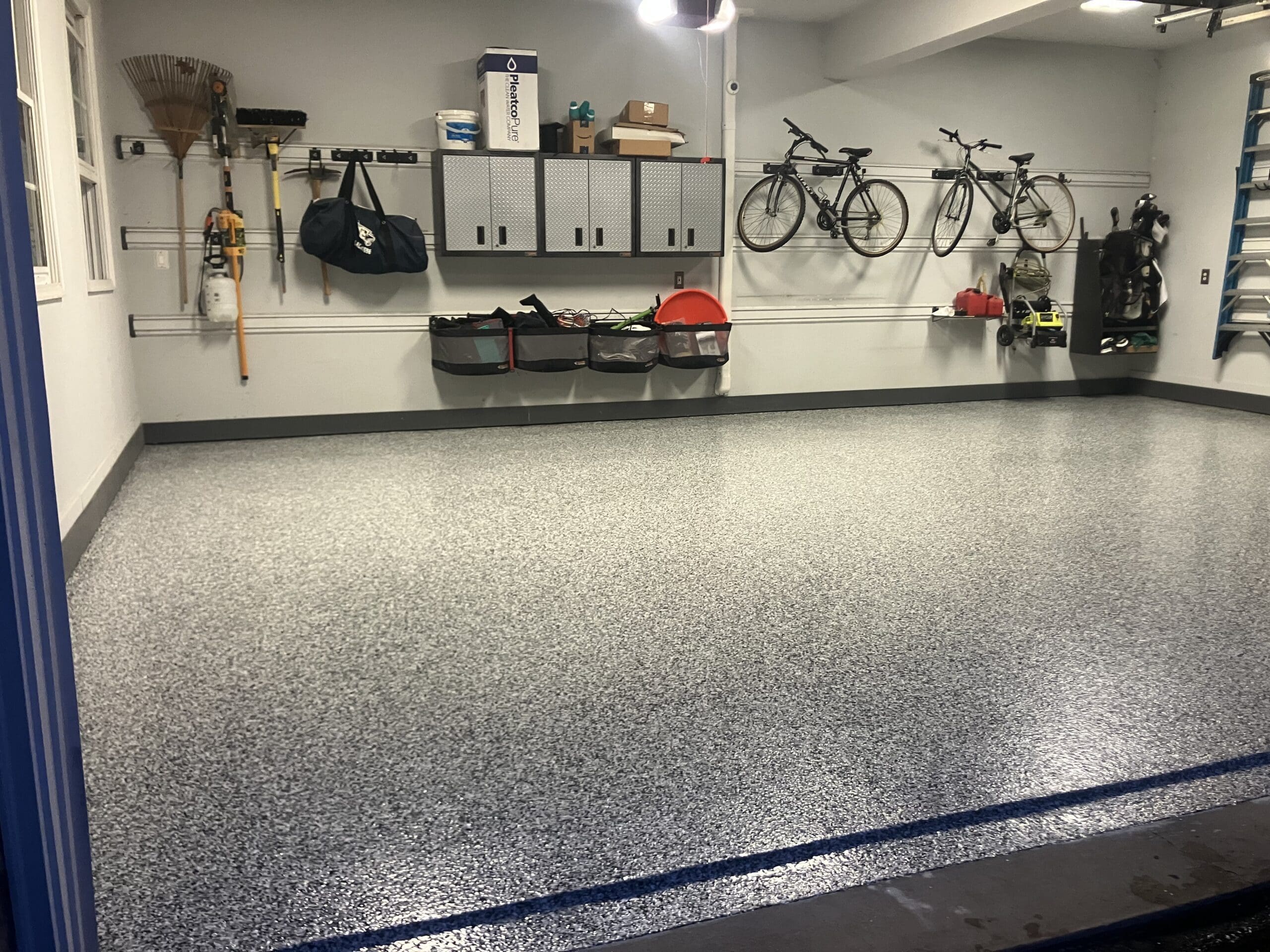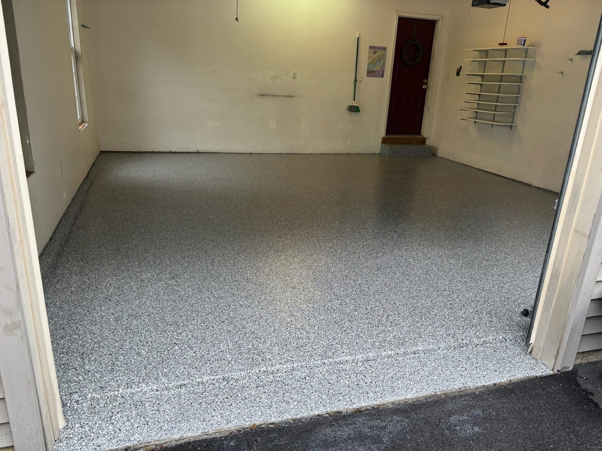 After custom shelving painting and flake floor was installed