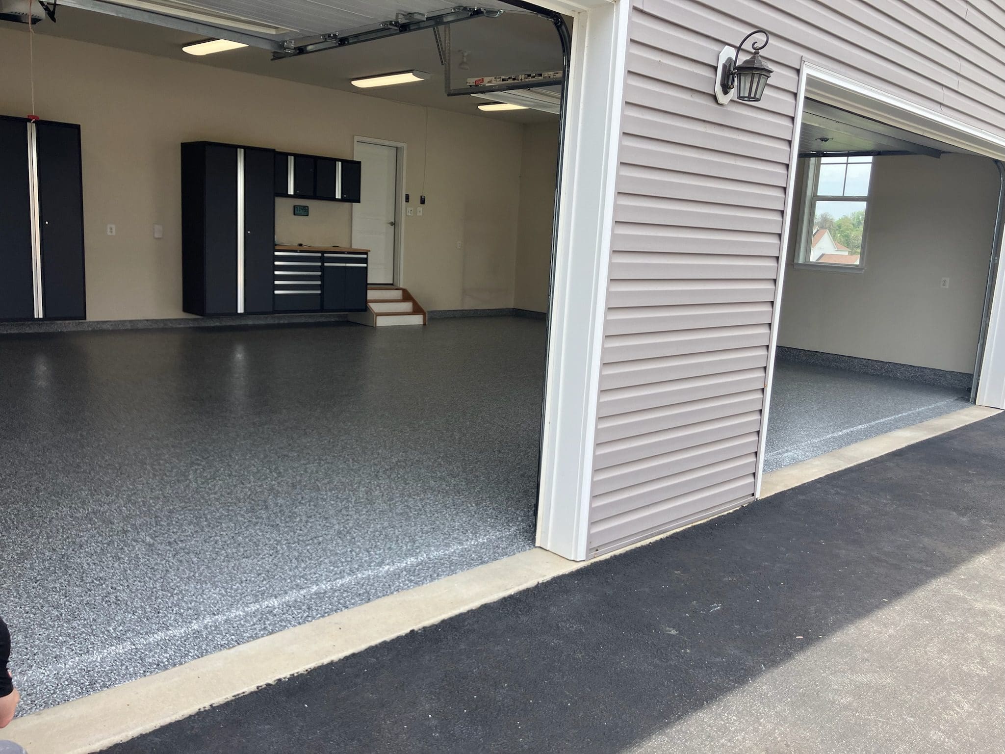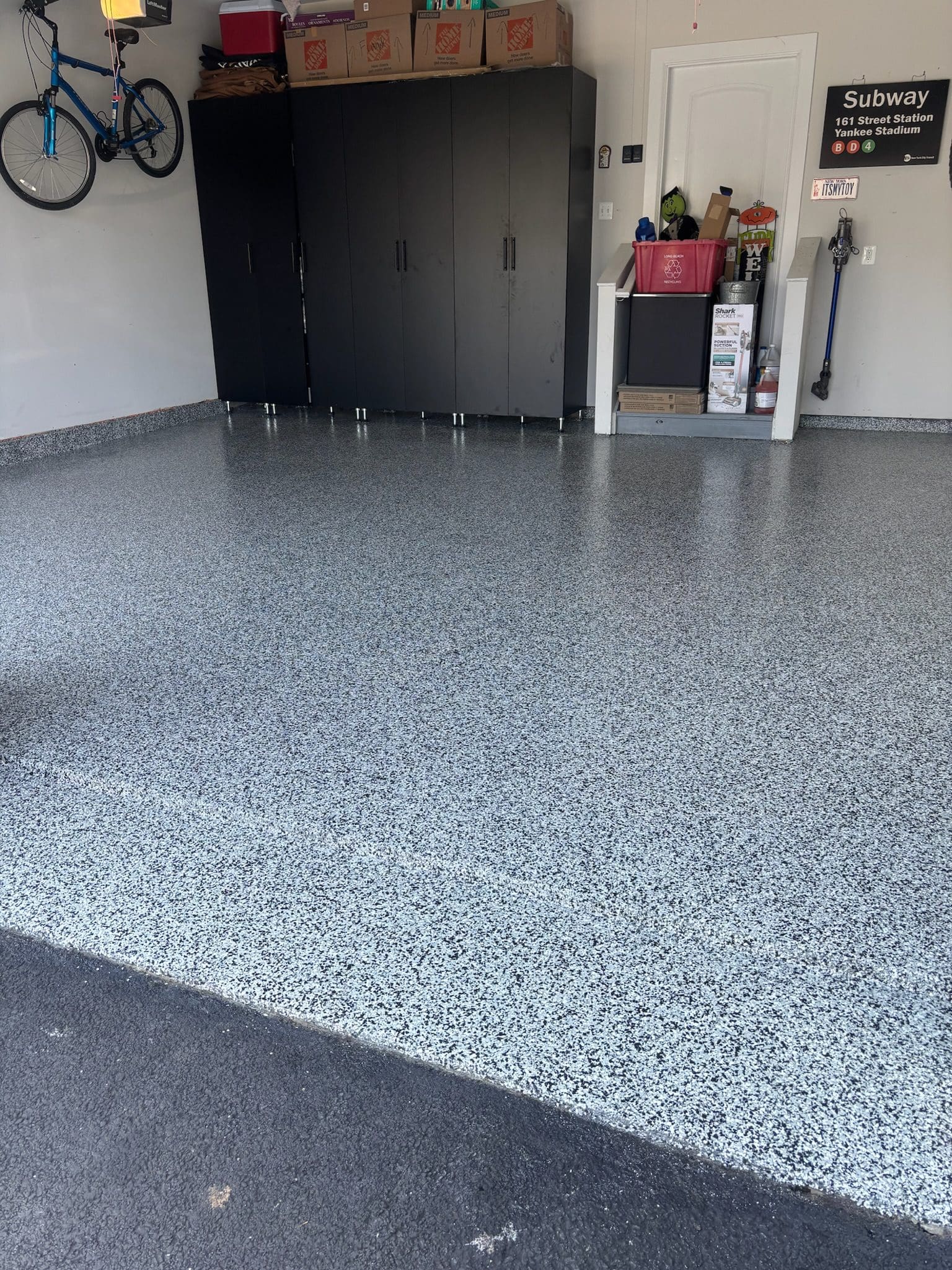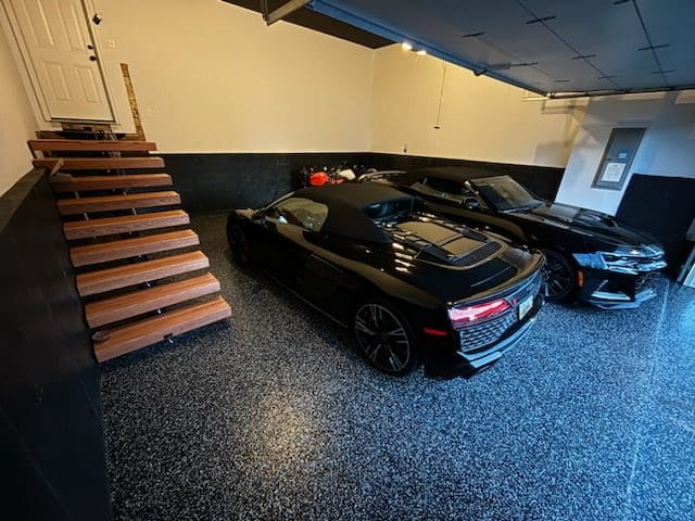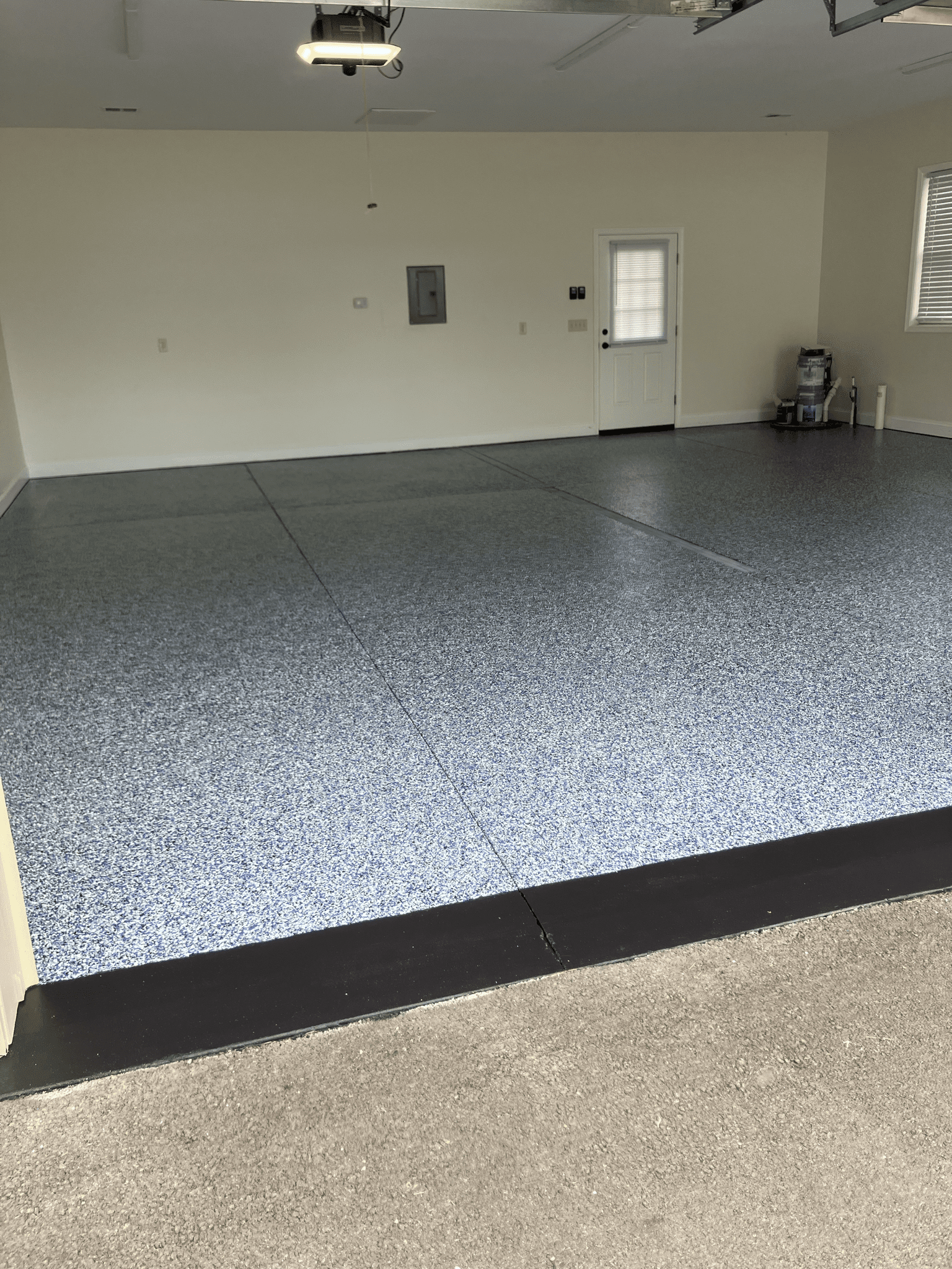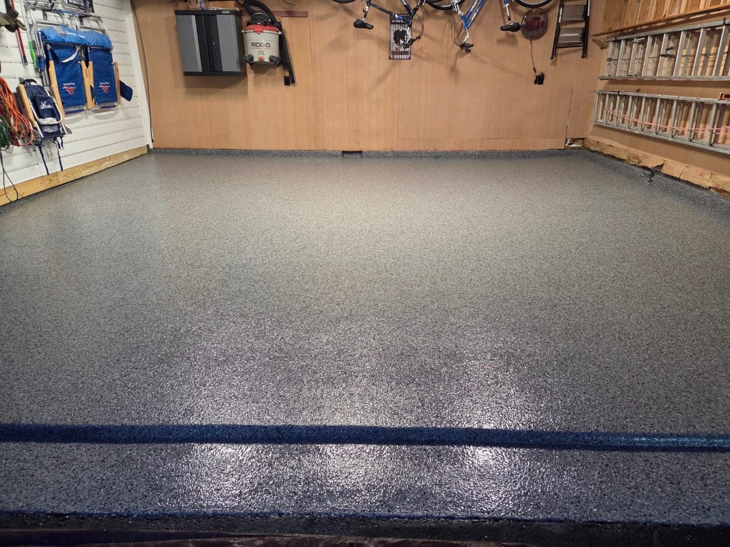 After custom shelving painting and flake floor was installed