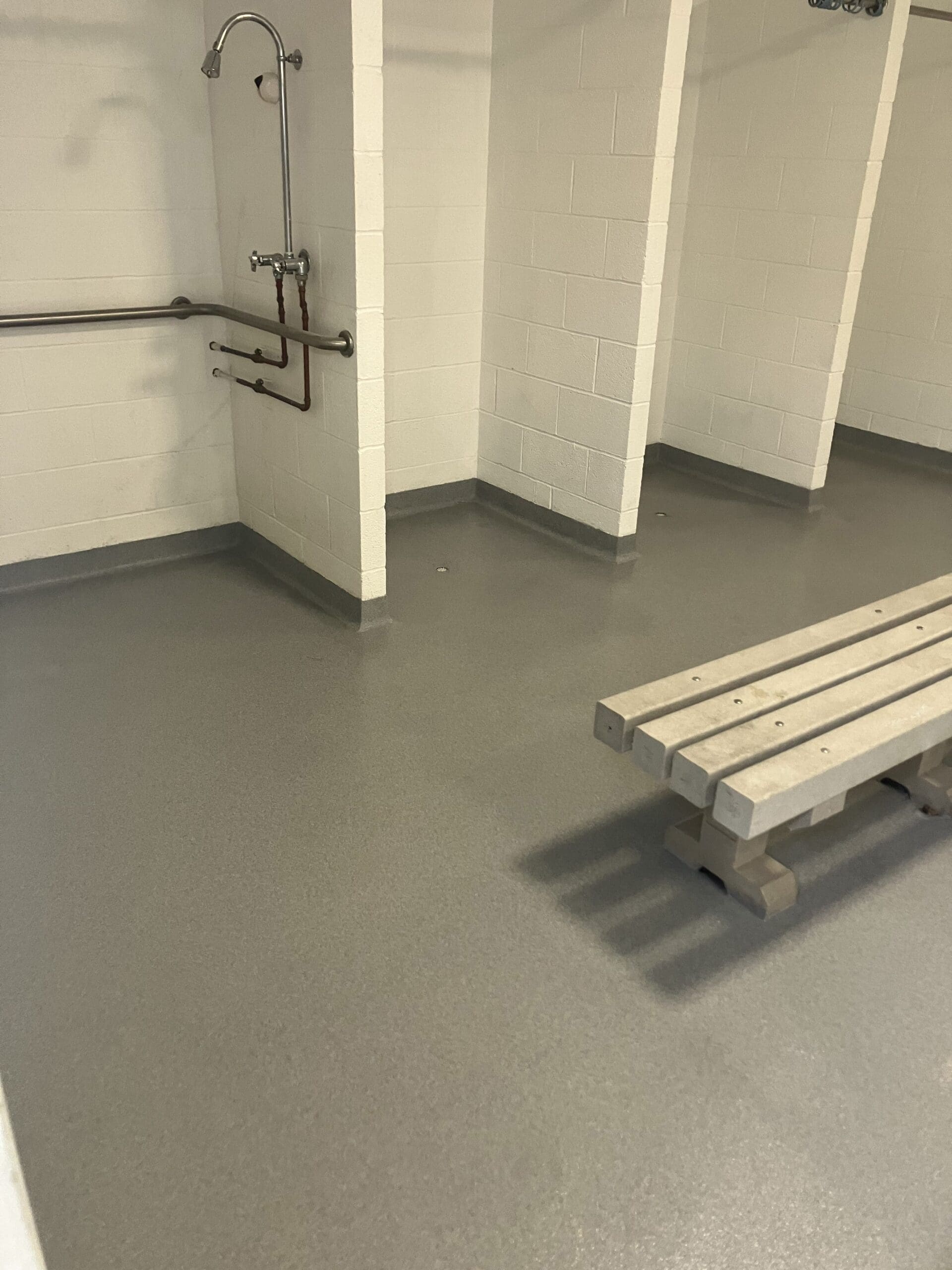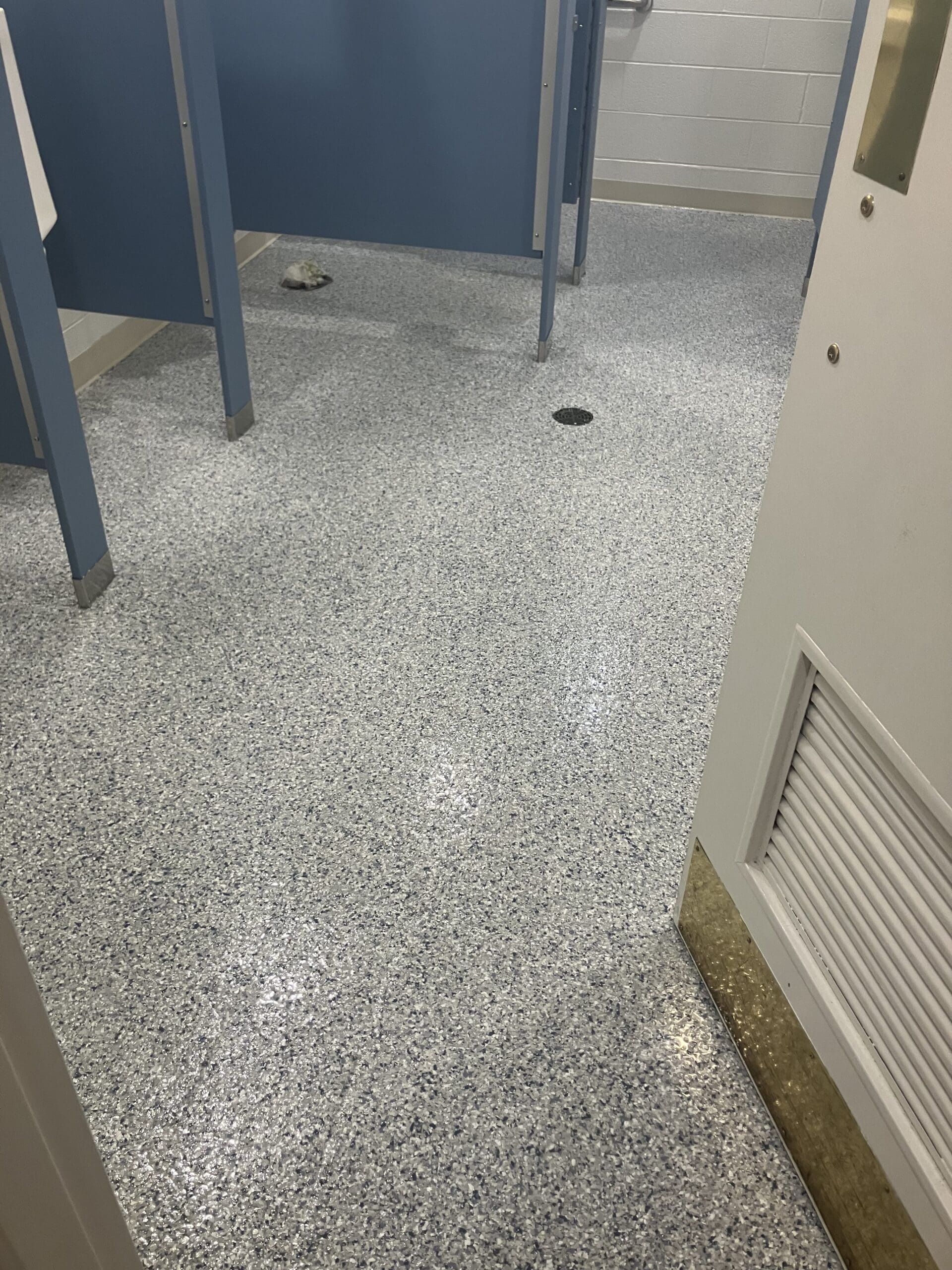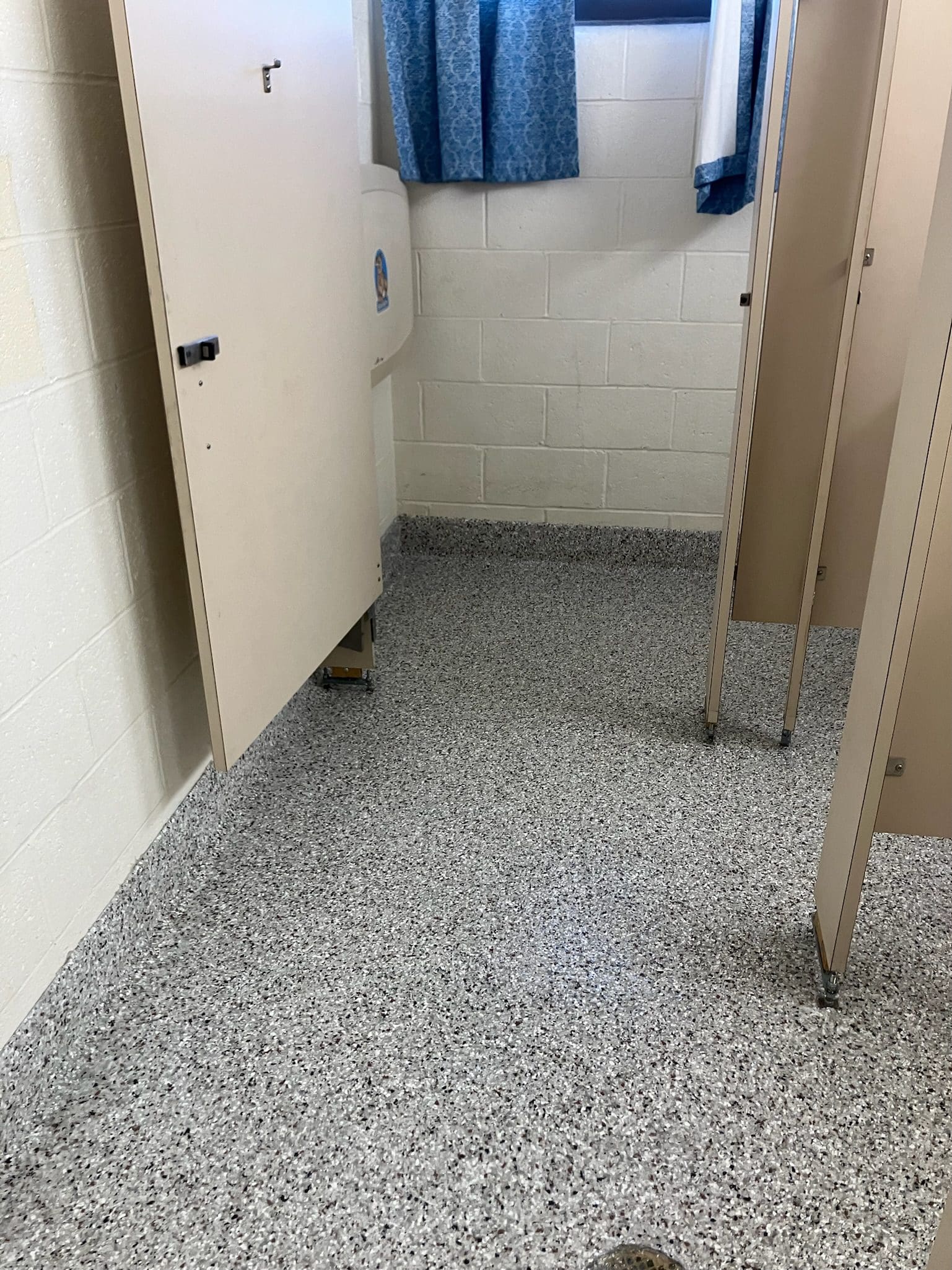 After for hoa pool house bathrooms - icicle quartz double broadcast with a polyaspartic topcoa